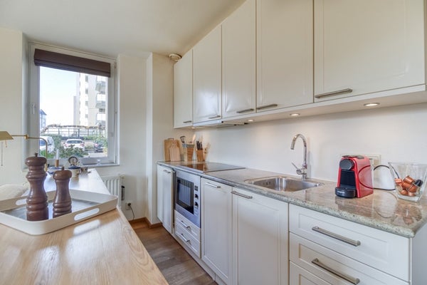 De keuken is voorzien van alle hedendaagse gemakken als 4-pits inductie kookplaat, afzuigkap, spoelbak, oven, koelkast en vaatwasmachine.