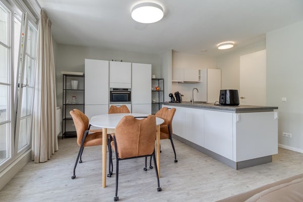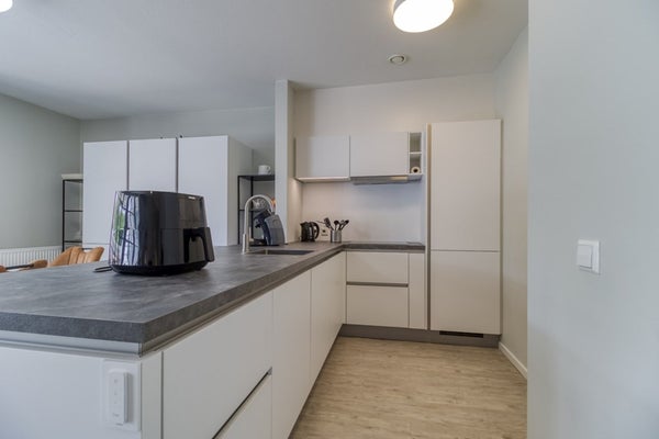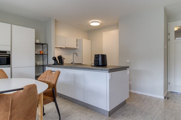 aangenaam verrast door het vele lichtinval dat binnenvalt door de grote ramen over bijna de gehele breedte van het appartement. De woonkamer heeft een open keuken en een zit- een eethoek. De moderne keuken in heeft een eiland en is voorzien van alle nodige en geïntegreerde inbouwapparatuur zoals 4 pits- inductie kookplaat, afzuigkap, spoelbak, combi-magnetron, vaatwasmachine, koelkast en diepvries. Via maar liefst een viertal dubbele opendraaiende deuren komt u op het windbeschutte balkon (9,90 m2) gelegen op het zuiden. Wanneer u de deuren volledig openzet betrekt u het balkon optimaal bij de leefruimte. Zowel vanuit de woonkamer als vanaf het balkon is er zicht op veel groen en bomen wat erg aangenaam is.