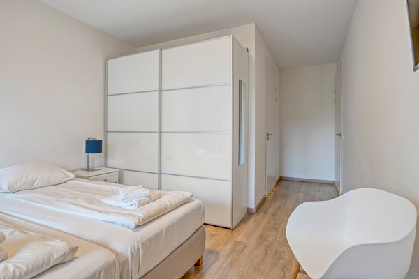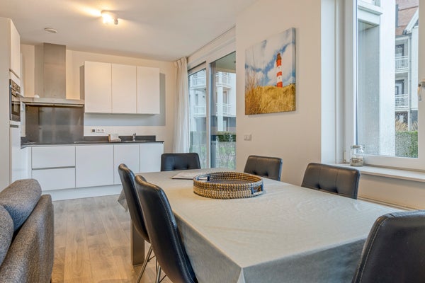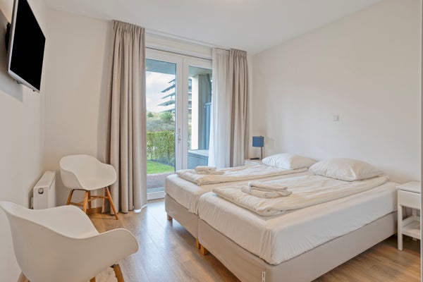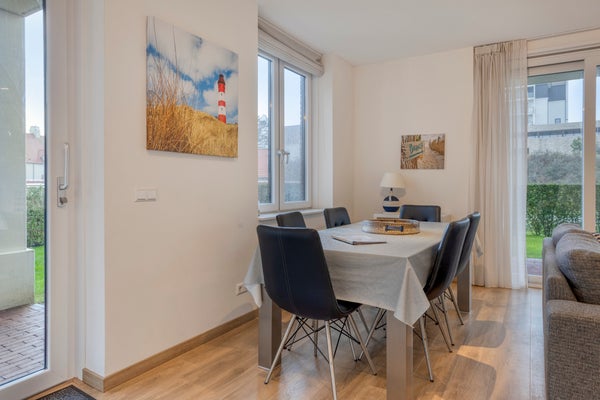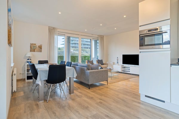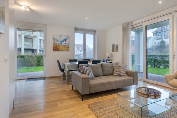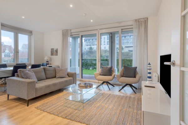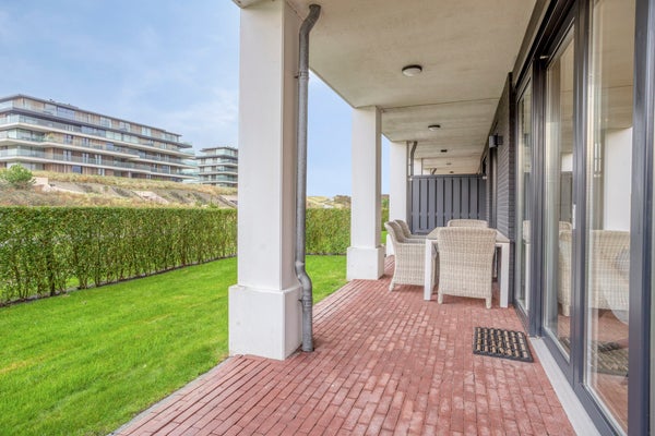 Dit stijlvolle, volledig gemeubileerde appartement op de begane grond in Duinhof Oost, gebouw IX, biedt een harmonieuze mix van comfort en licht. Bij binnenkomst bereikt u een lichte woonkamer met grote raampartijen en directe toegang tot de royale, zonnige tuin van circa 102 m². De moderne open keuken is uitgerust met handige apparaten en biedt ook toegang tot de tuin. Het appartement telt twee slaapkamers, beiden met een eigen luxe badkamer, waarbij de grootste badkamer beschikt over een ligbad en douchefunctie. De tuin en het terras van ongeveer 28 m² zijn perfect voor ontspanning. Daarnaast is er een privéparkeerplaats en een afsluitbare berging. Het appartement is gelegen op loopafstand van het strand en de voorzieningen van Cadzand-Bad.