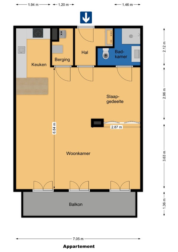 - De galerijflat heeft een woonoppervlakte van 64 m² en beschikt over 1 kamer, waarvan 1 slaapkamer;