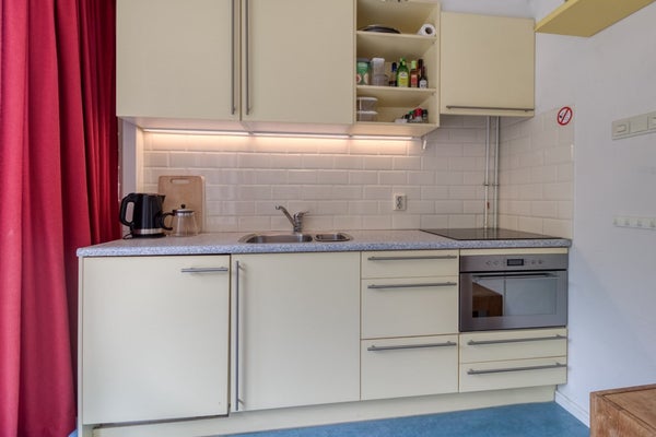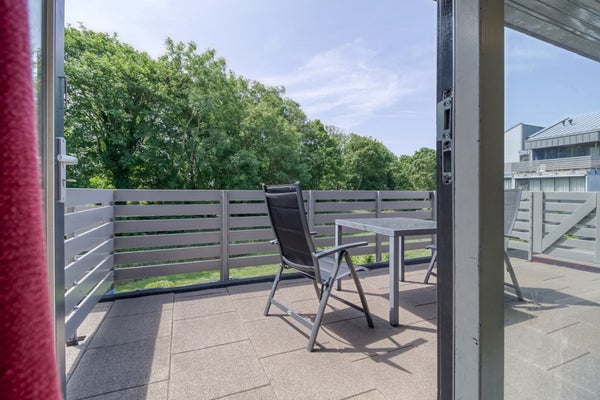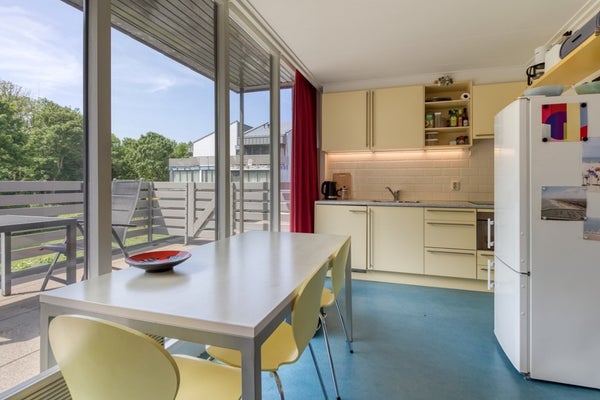 De woonkamer heeft een deur naar het balkon (5,48 m x 2,88 m) gelegen op het zuiden. Vanuit de woonkamer en vanaf het balkon is er voornamelijk zicht op bomen en groen wat erg aangenaam is. Aangrenzend aan het balkon bevindt zich en groot gemeenschappelijk balkon waardoor de buitenruimte erg open en ruimtelijke aanvoelt. Dit balkon is direct toegankelijk vanaf het eigen balkon. Tevens heeft het balkon een windscherm zodat het al heel vroeg in het jaar heerlijk is om buiten te zitten. De keuken in het appartement is voorzien van; 4-pits inductie kookplaat, afzuigkap, grote en kleine spoelbak, combi-magnetron en losse koel/vriescombinatie. Vanuit de hal zijn de badkamer met douche en wastafel en een apart toilet met fonteintje te bereiken.