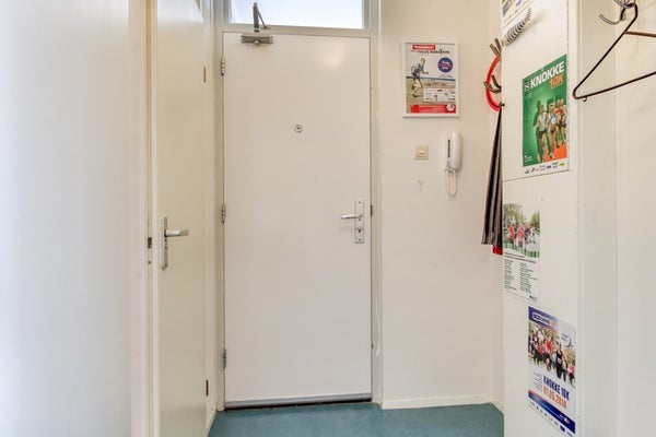 Via de gemeenschappelijke inkomhal kunt u met de trap naar de eerste verdieping. U komt het appartement binnen in de hal met ruimte voor de garderobe.