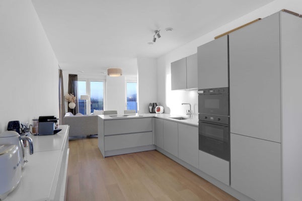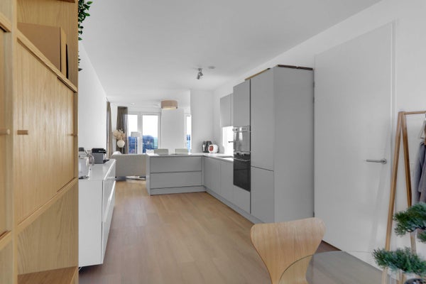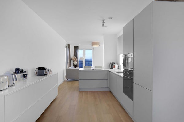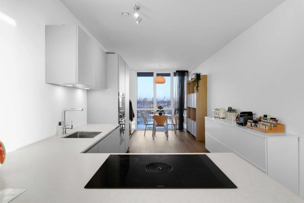 De luxe open keuken vormt het stijlvolle middelpunt van het appartement en is uitgevoerd in grijs met een wit aanrechtblad. De keuken is voorzien van hoogwaardige inbouwapparatuur, waaronder een inductiekookplaat met geïntegreerde afzuiging, oven, magnetron, koel-vriescombinatie en vaatwasser. Aan de achterzijde is ruimte voor een gezellige eethoek.