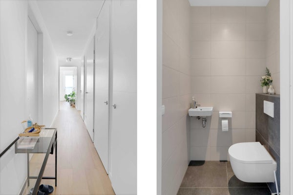 Via de hal, die toegang biedt tot alle vertrekken, betreed je het appartement. De woning is volledig afgewerkt met een fraaie vloer en strak gestucte wanden en plafonds, wat zorgt voor een luxe en warme uitstraling.