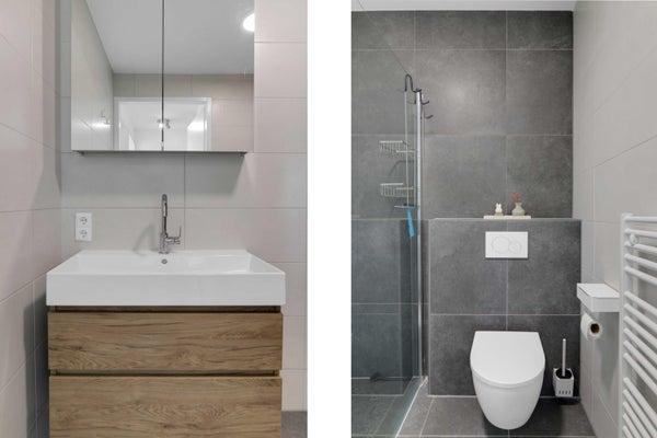 De moderne badkamer is luxe afgewerkt met donker grijze tegels en witte accenten. Hier vind je een inloopdouche, wastafelmeubel en en een toilet. Daarnaast beschikt de woning over een separaat toilet, uitgevoerd in dezelfde stijlvolle afwerking als de badkamer
