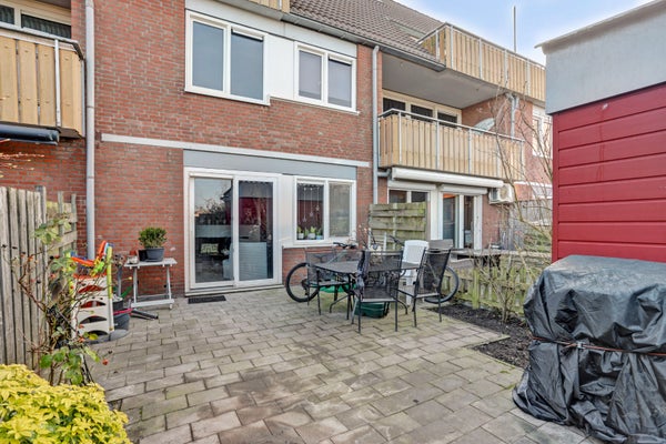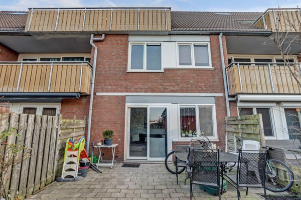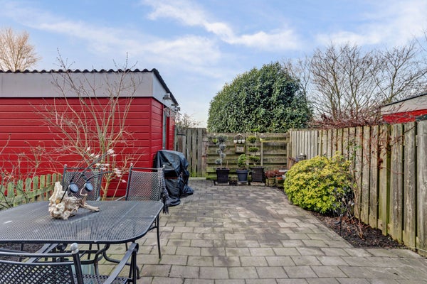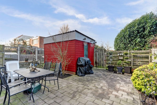 De achtertuin van ca. 36 m² ligt heerlijk op het zuidwesten, zodat u volop van de zon kunt genieten. Achterin de tuin staat een houten berging en er is een achterom aanwezig.