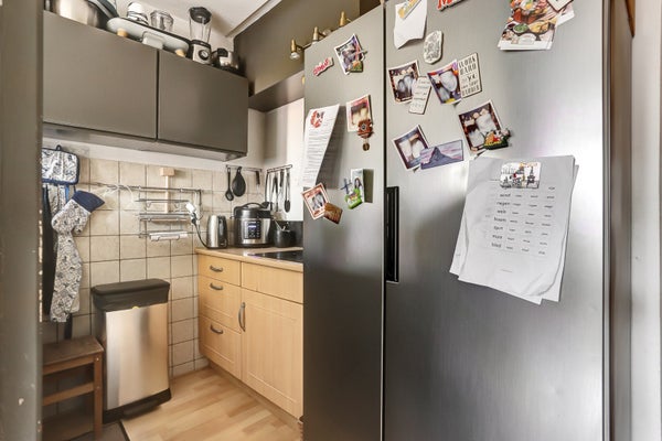 De halfopen keuken sluit aan op de woonkamer en beschikt over keukenblokken aan twee zijden met bovenkastjes, wat zorgt voor voldoende bergruimte.