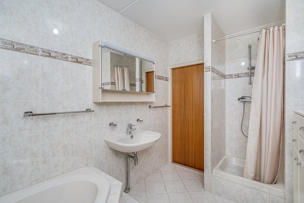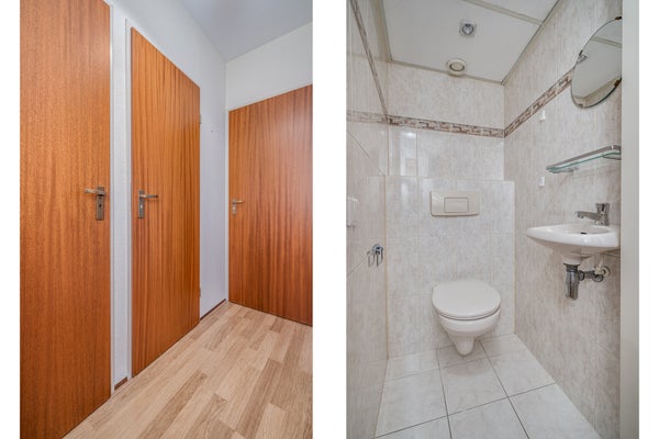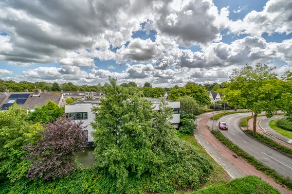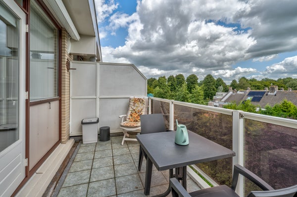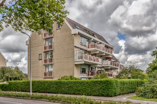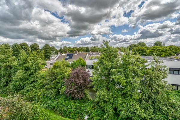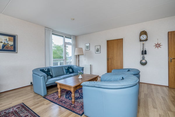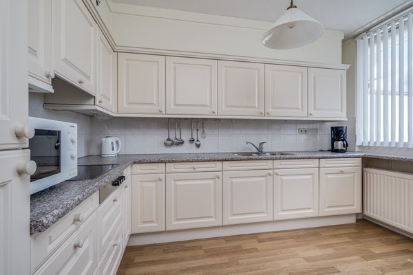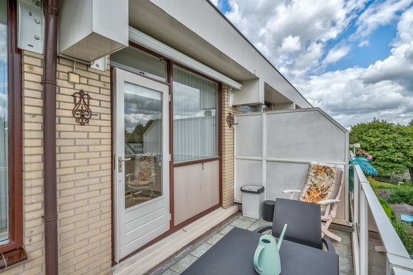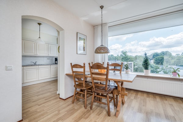 Dit appartement heeft een toegankelijke entreehal met videofoon en brievenbussen. De verdieping wordt gedeeld met slechts één ander appartement. In de hal vind je de garderobe, de CV-kast en toegang tot de lichte woonkamer van 49m2, die is voorzien van grote raampartijen en een halfopen keuken met een landelijke inrichting. Deze keuken heeft onder andere een keramische kookplaat en vaatwasser, en biedt toegang tot een terras van ongeveer 9m2 met vrij uitzicht over een groene omgeving. De hoofdslaapkamer is ongeveer 17m2 en beschikt over een badkamer met hoekligbad, douche en wastafel. Daarnaast zijn er een tweede slaapkamer van 12m2, een apart toilet en een wasmachinekast. De woning heeft een eigen garage van 6.59x2.61m en is volledig voorzien van houten kozijnen met dubbel glas.