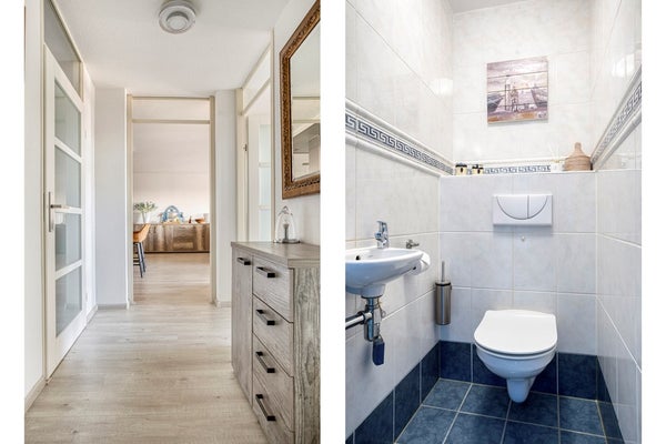 Toilet, eveneens geheel betegeld, voorzien van een hangend closet en een fonteintje.