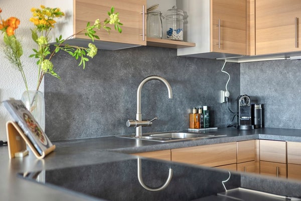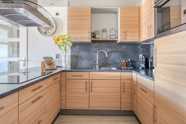 Keuken, voorzien van een U-vormig keukenblok en divers apparatuur: een inductiekookplaat met afzuigkap, vaatwasser, kokendwaterkraan, combimagnetron, koelkast en een hoekcarrousel.
