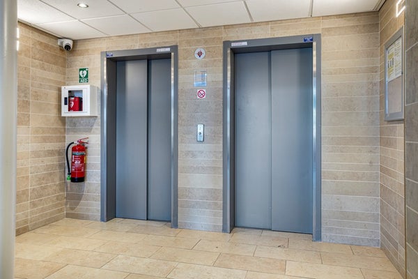 Afgesloten entree met brievenbussen, bellentableau met camera, toegang tot de privé-bergingen, dubbele liftinstallatie en trapopgang.