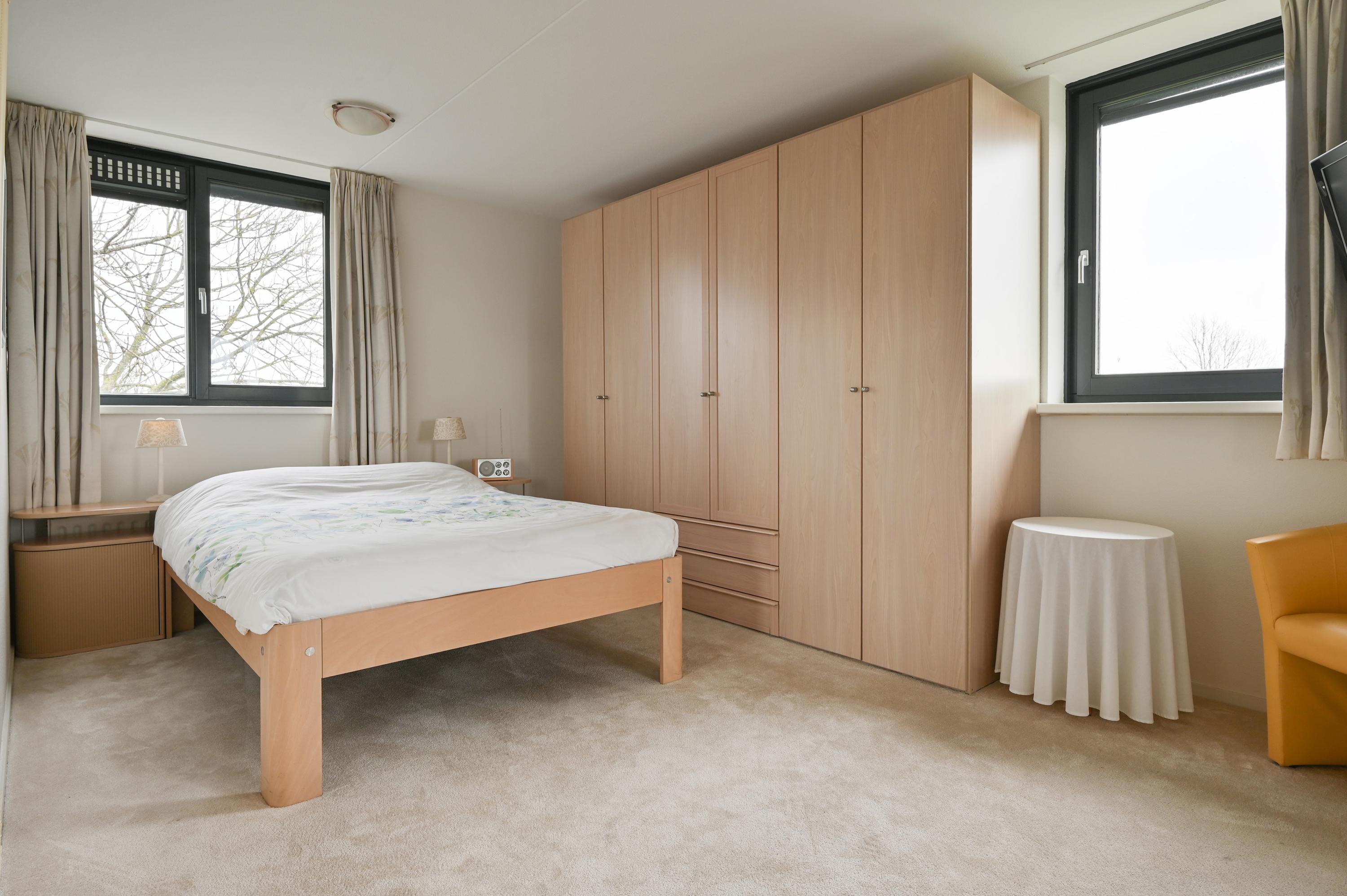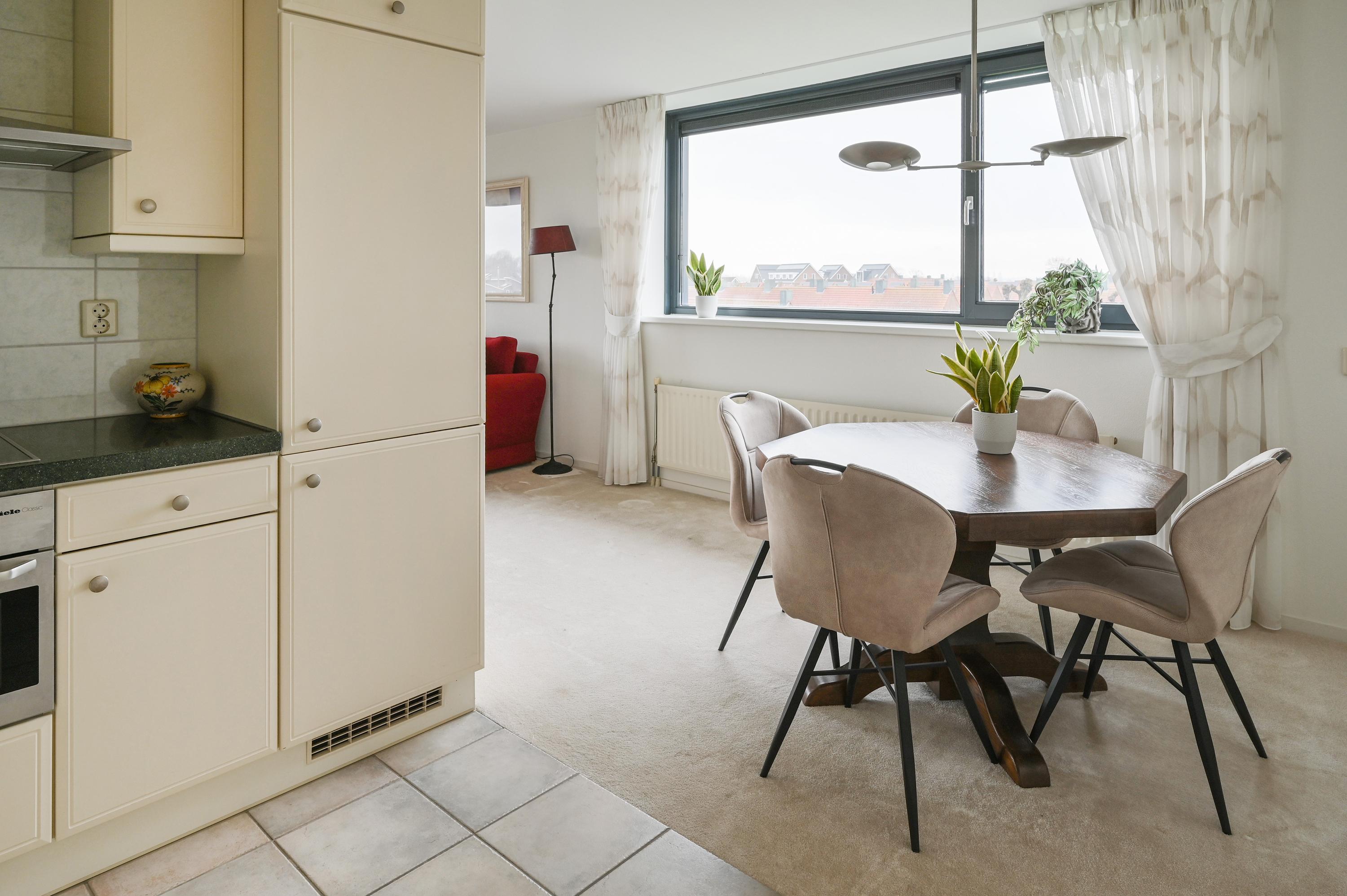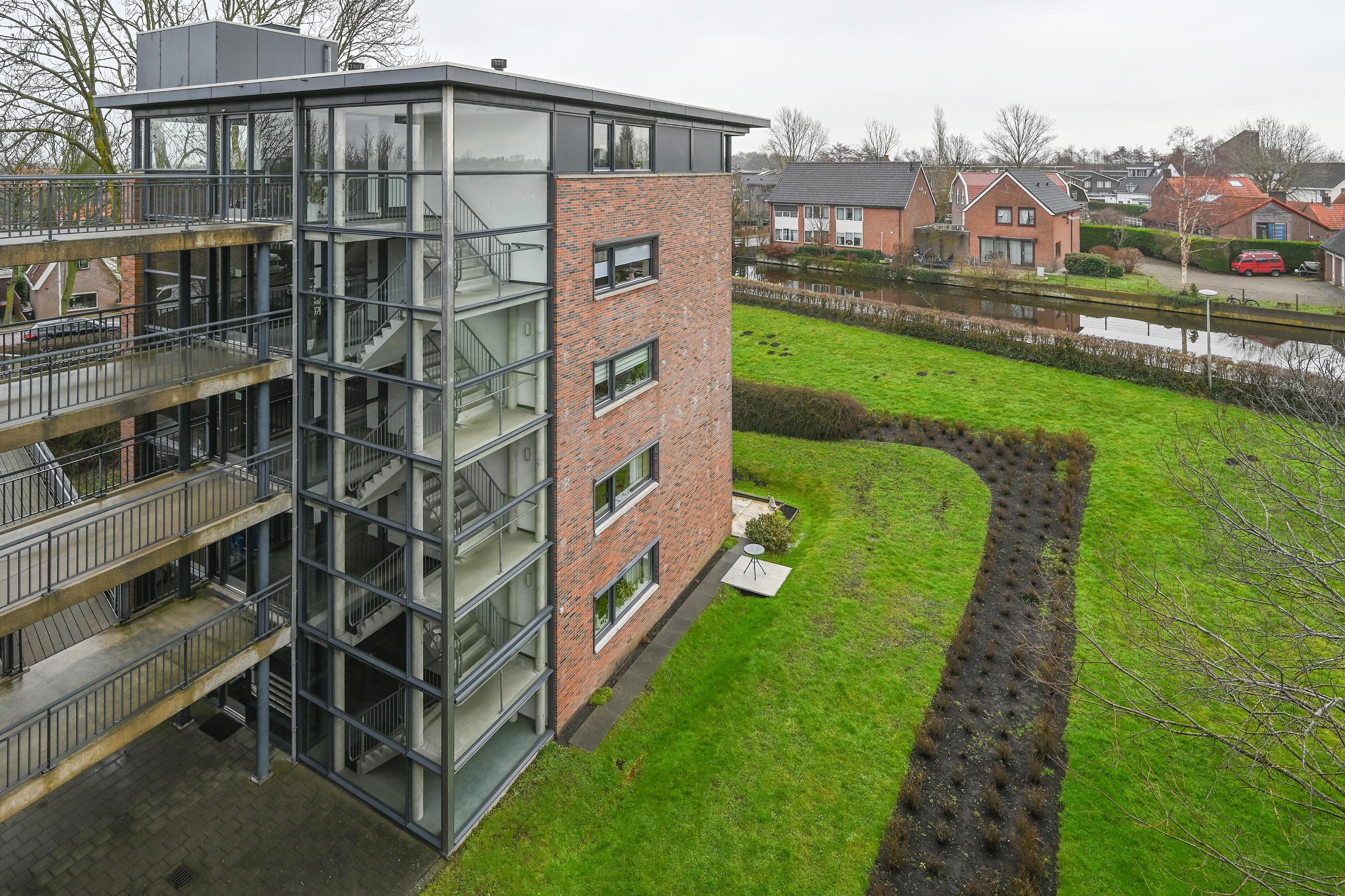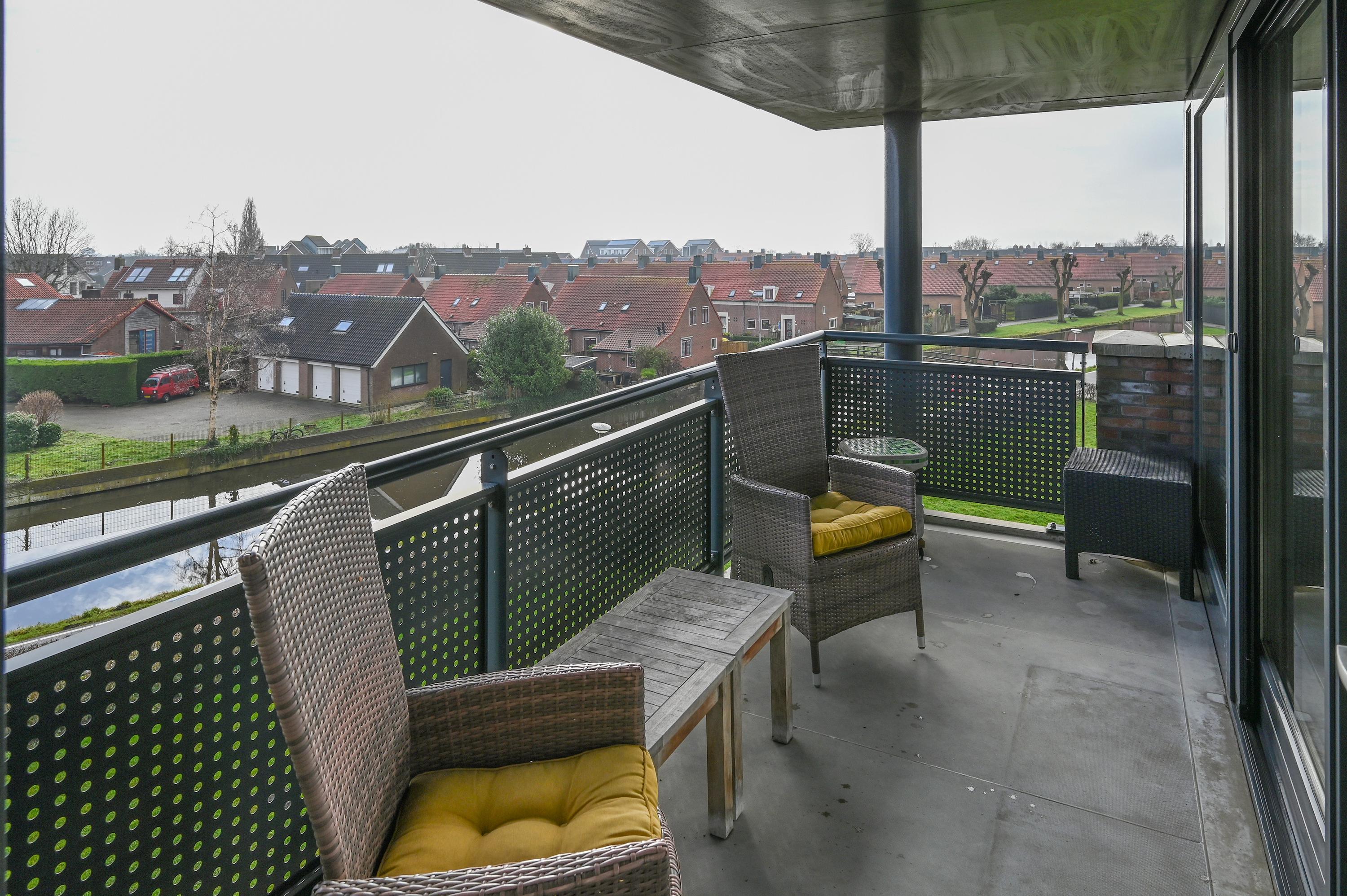 Dit 55+ topappartement met garage en berging ligt op de bovenste verdieping van het appartementencomplex in De Kwakel. Het heeft twee slaapkamers en biedt een prachtig uitzicht op de Ringvaart door de brede raampartij. De indeling is speels en de woonkamer met L-vormige keuken is ruim genoeg voor een zithoek en eettafel. De grootste slaapkamer heeft directe toegang tot het balkon, dat ook via de woonkamer bereikbaar is. De badkamer is praktisch ingericht met een hoekdouche en wastafel, en er is een aparte toiletruimte. Op de begane grond is er een garage met elektrische deur en extra berging. De lift en nabijheid van winkels en openbaar vervoer maken het wonen hier comfortabel. De actieve VVE houdt het complex prima onderhouden.