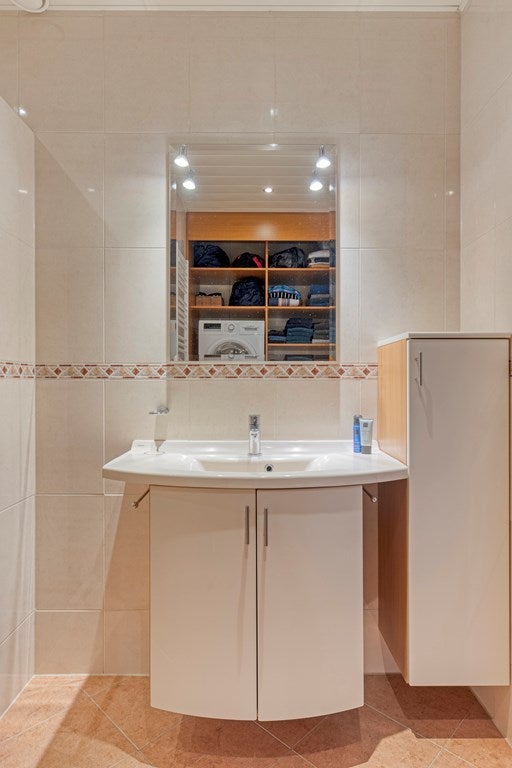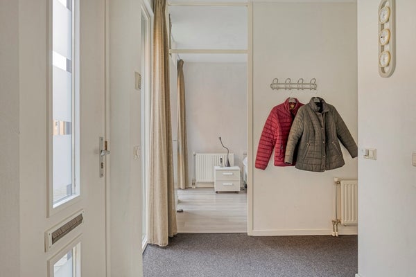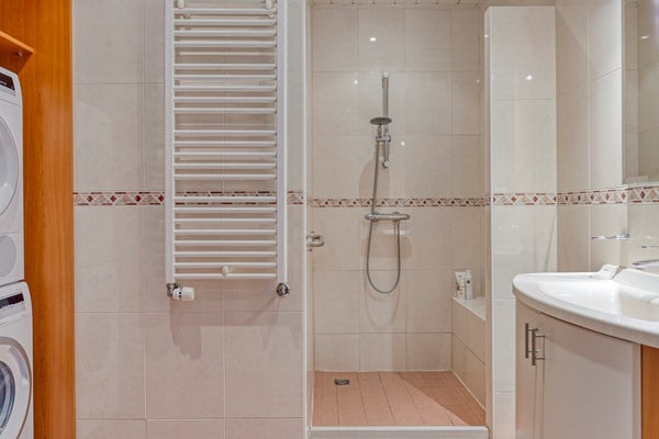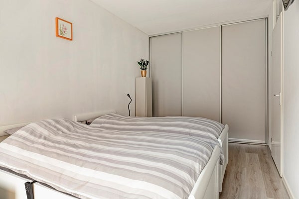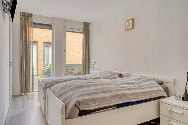 De ruime slaapkamer is voorzien van een vaste kastenwand en biedt voldoende ruimte voor een groot tweepersoonsbed. Via de slaapkamer bereikt u de badkamer. Deze is voorzien van een douche, wastafelmeubel en een inbouwkast voor de wasmachine en droger.