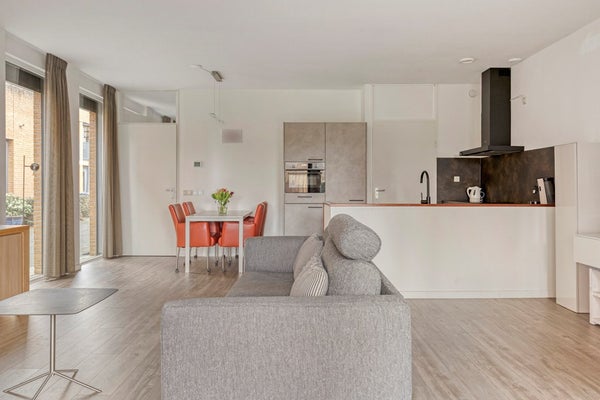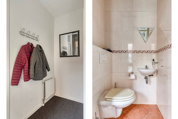 Entree met ruime hal, meterkast (7 groepen + 2 a.l.s.) en toilet met wandcloset en fonteintje. De woonkamer is voorzien van een laminaatvloer. Via een loopdeur heeft u toegang tot een overdekt buitenterras over de gehele breedte van de woonkamer. De grote raampartijen tot de grond zorgen voor een prettige lichtinval.