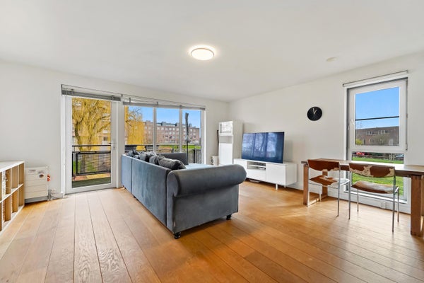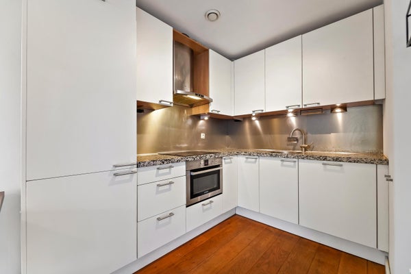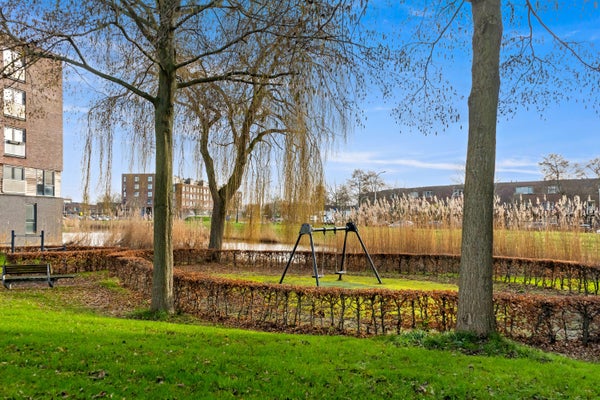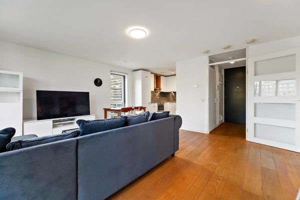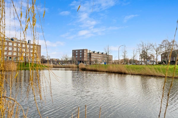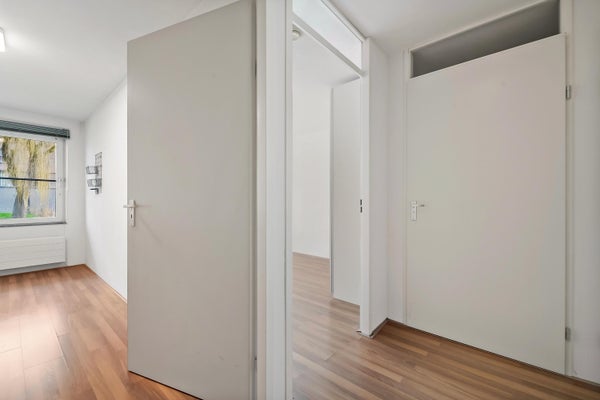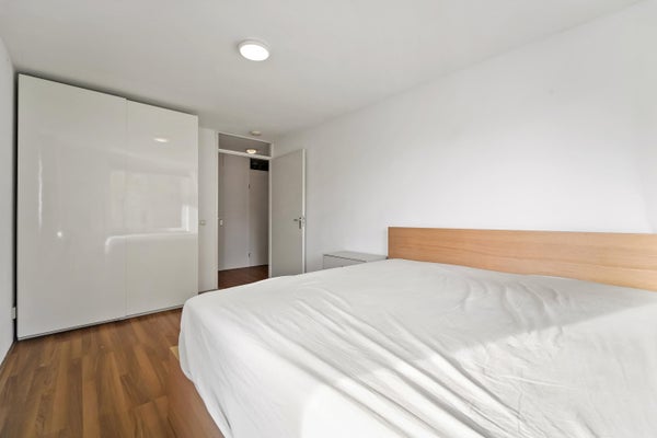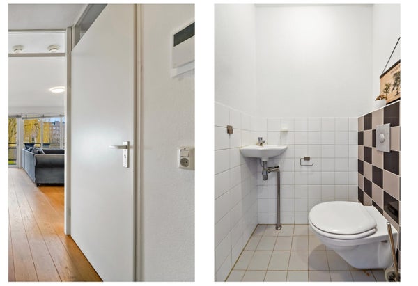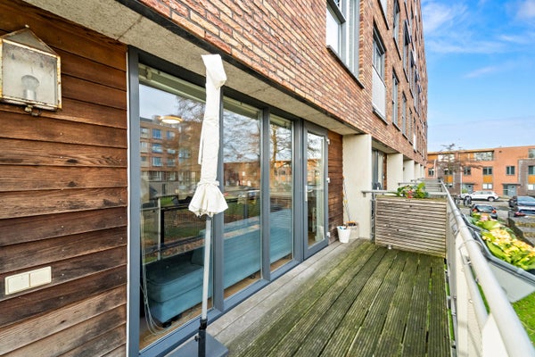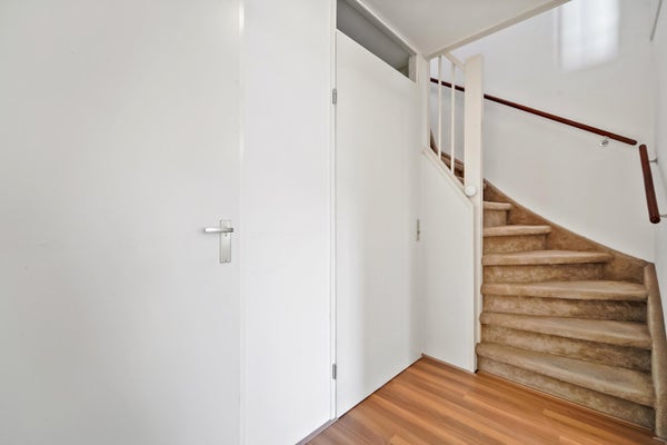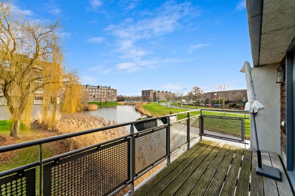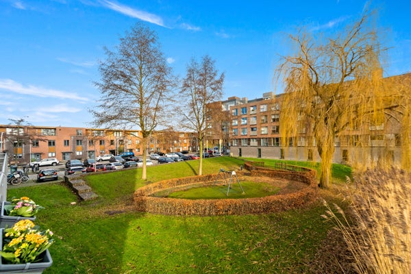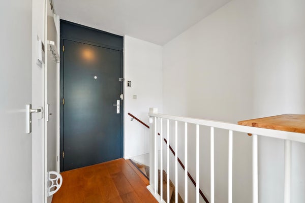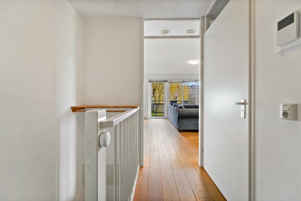 Op de eerste verdieping kom je binnen in de hal, die toegang biedt tot een hangend toilet en een meterkast. De lichte woonkamer, met grote ramen en een extra zijraam, geeft toegang tot het brede balkon. De open keuken is uitgerust met inbouwapparatuur en heeft een praktische indeling. Via de trap bereik je de slaapverdieping met twee ruime slaapkamers en een inpandige badkamer met douche en wastafel. Tevens is er een technische ruimte met CV-combiketel en een berging voor de wasmachine. De gebruiksoppervlakte bedraagt 71 m².