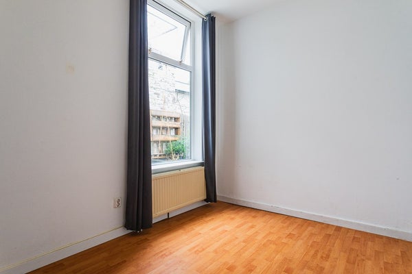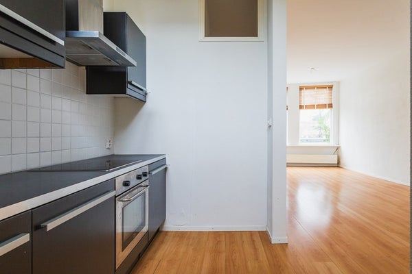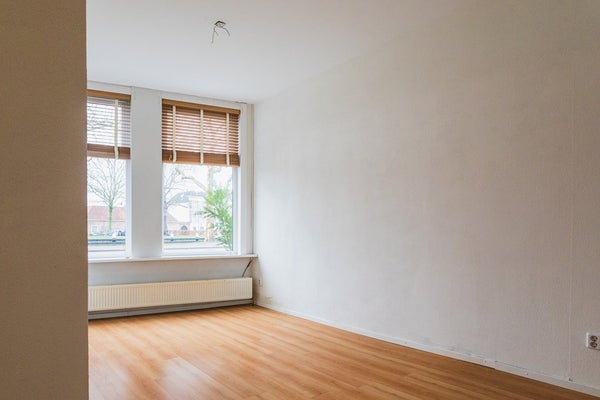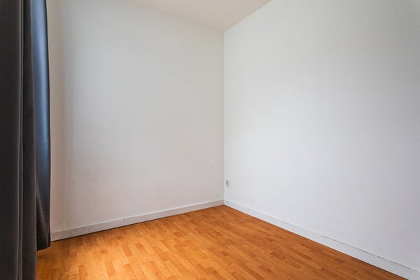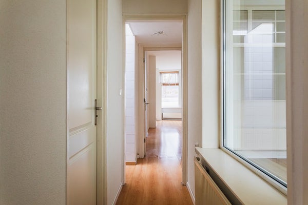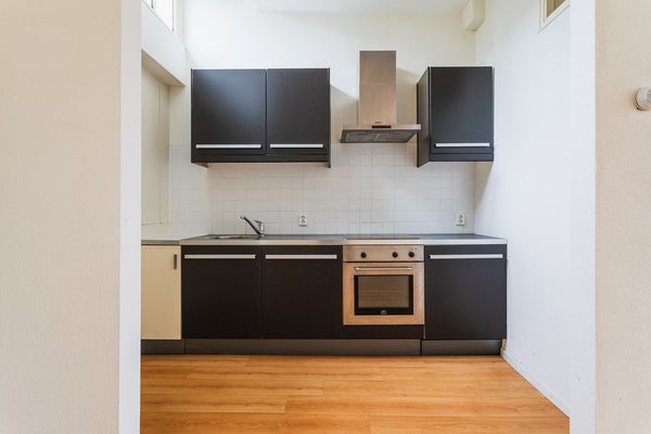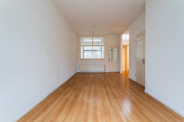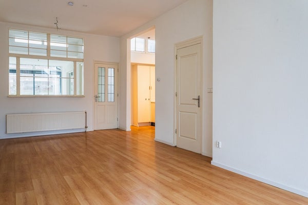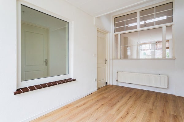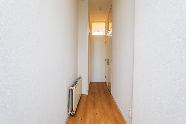 Through the entrance you enter the hallway with a meter cupboard, a practical storage space under the stairs and a separate toilet. The living room is generously sized and offers ample space for both a seating and dining area. Thanks to the double glazing, the apartment is comfortable to live in. At the rear is the open kitchen, equipped with a dishwasher, electric hob, extractor hood and a freestanding refrigerator.