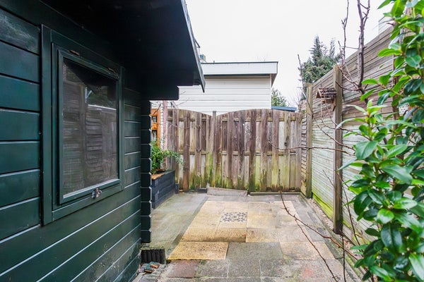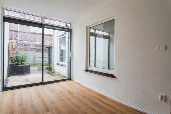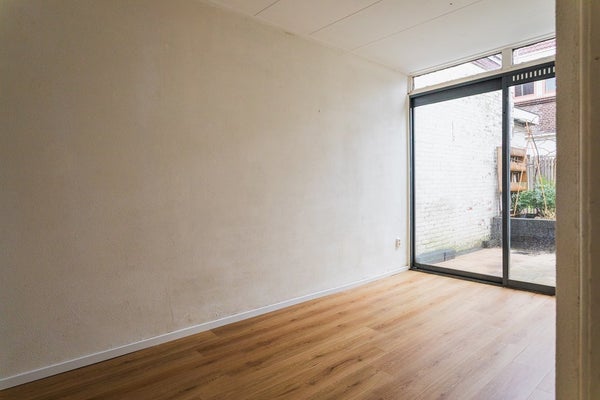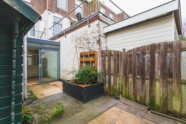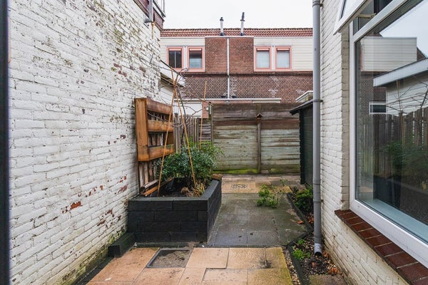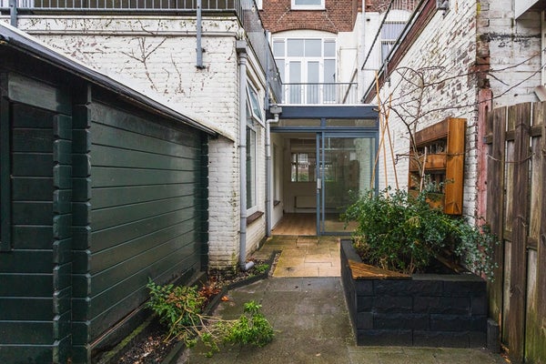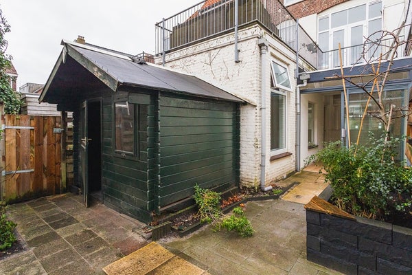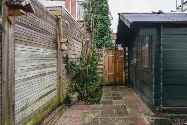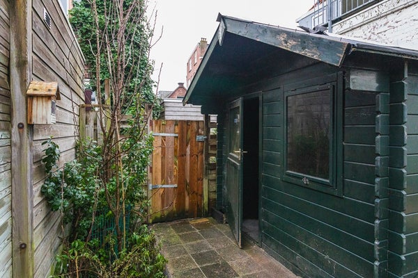 Vanuit de tuinkamer heb je toegang tot de ca. 6,80 meter diepe tuin met houten schuur en een handige achterom – een fijne buitenruimte om van het voorjaar tot het najaar te genieten.