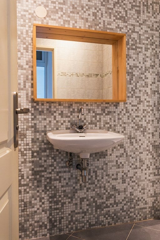 Via de gang bereik je de wasmachine-aansluiting en de badkamer, die is uitgerust met een douche, tweede toilet en wastafel. De slaapkamer is rustig gelegen. Daarnaast is er een tuinkamer, ideaal als werkruimte, eetkamer of extra zitkamer. Vanuit deze ruimte zorgen de schuifpui en het directe contact met de tuin voor veel licht en een prettige verbinding tussen binnen en buiten.