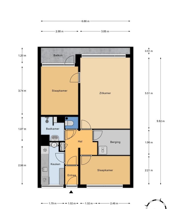 - De galerijflat heeft een woonoppervlakte van 65 m² en beschikt over 3 kamers, waarvan 2 slaapkamers;