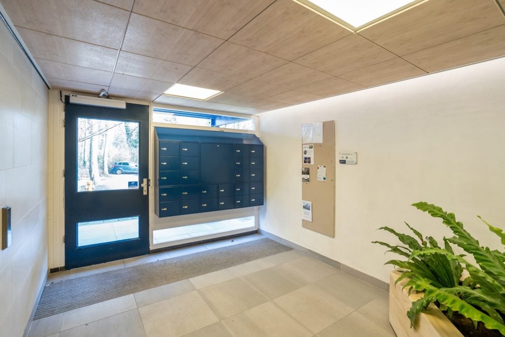 De indeling omvat een centrale entree met lift en slechts twee appartementen per verdieping. Het appartement zelf heeft een lichte woonkamer, moderne open keuken met apparatuur, drie slaapkamers, en een luxe badkamer. Gebruiksoppervlakte bedraagt 104 m2 en het is gebouwd in 1972.