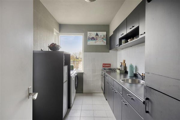 De gesloten keuken is compleet uitgerust met een 4-pits gaskookplaat, afzuigkap, koel- vriescombinatie, combi-magnetron en een vaatwasser. Tevens bevinden zich hier de aansluiting voor de wasmachine en de toegang tot het balkon.