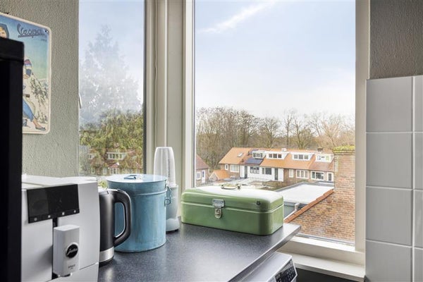Het op het noorden gelegen balkon biedt een fraai en weids uitzicht over de wijk en vormt een prettige buitenruimte. Daarnaast beschikt het balkon over een praktische bergkast.