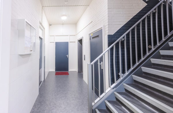 Via de centrale ingang van het appartementengebouw (met intercomsysteem) bereik je met de trap of de lift het appartement op de eerste verdieping.