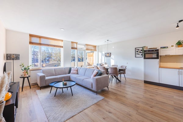 De ruime woonkamer (met open keuken) van ca 34 m2 is netjes afgewerkt met stucwerk wanden. De grote raampartijen laten lekker veel licht door in de woonkamer en keuken.