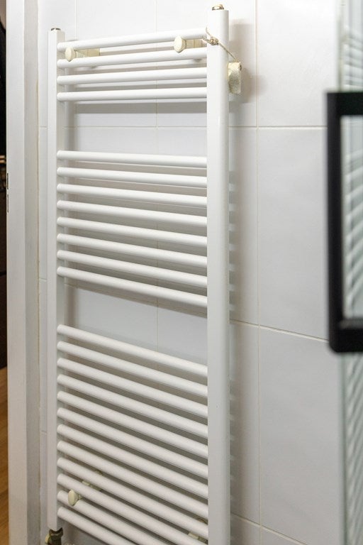 De vloer en wanden zijn hier volledig betegeld. De designradiator zorgt voor een aangename temperatuur en voor het ophangen en drogen van je handdoeken.