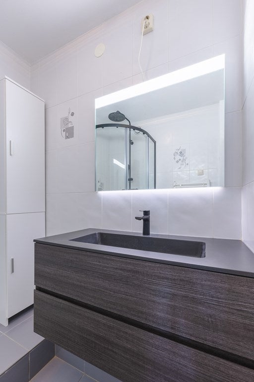 De badkamer is modern uitgevoerd met een (kwartronde) douchecabine met thermostaatkraan en regen- en handdouche en een wastafelmeubel met spiegel, voorzien van geïntegreerde verlichting.