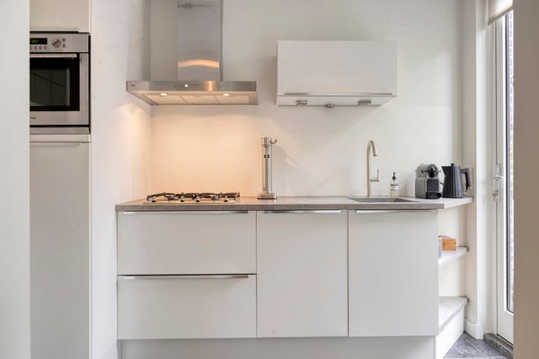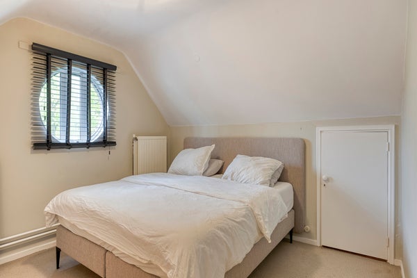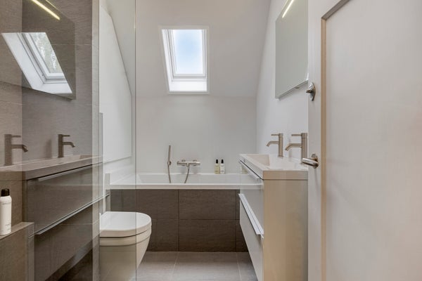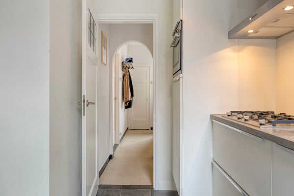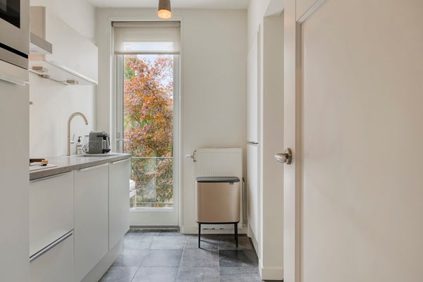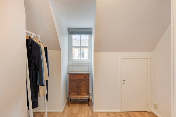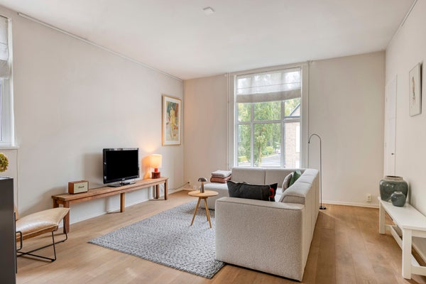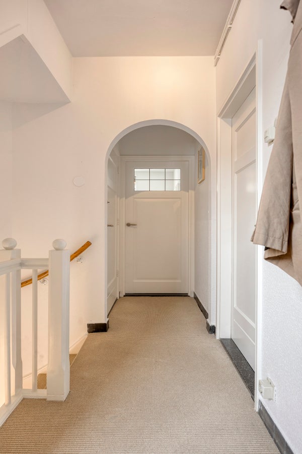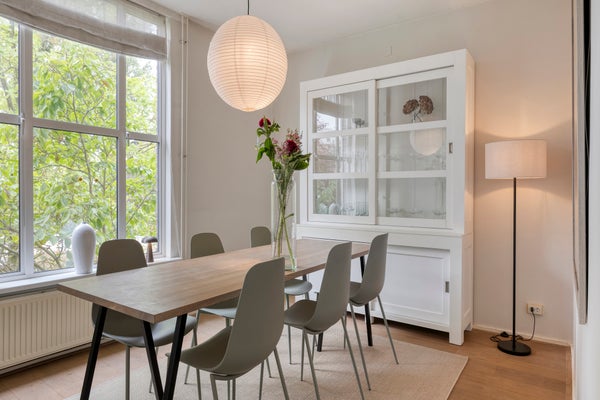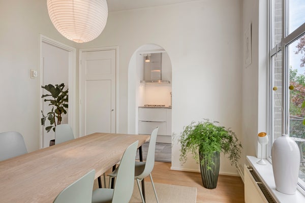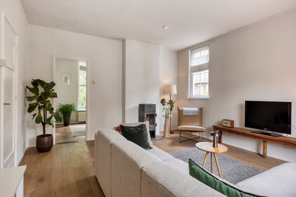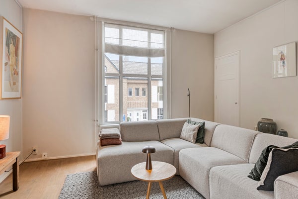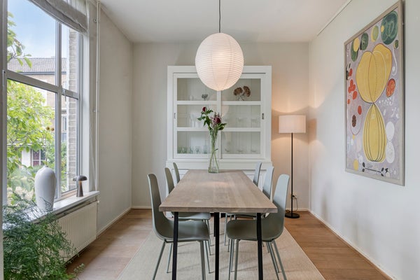 Aan de Hertog Janstraat 1 in 's-Hertogenbosch bevindt zich een sfeervolle, instapklare bovenwoning met karakter. Dit gemeentelijk monument, ontworpen door architect Jos Bedaux, is volledig opgeknapt en biedt een lichte woonkamer en suite, drie slaapkamers, een moderne keuken en badkamer, een balkon en een eigen berging. Je woont op een geliefde locatie, dichtbij natuurgebied Het Bossche Broek en de gezellige Bourgondische binnenstad. Bij binnenkomst vind je de trap naar de eerste verdieping, die ruimte biedt voor opslag onder de treden. De sfeervolle woonkamer is verdeeld in een zitgedeelte met een kachel en een eetkamer. De moderne keuken is van alle gemakken voorzien. Op de tweede verdieping zijn de slaapkamers met karakteristieke schuine wanden en de moderne badkamer. Hier is ook een praktische berging voor fietsen.