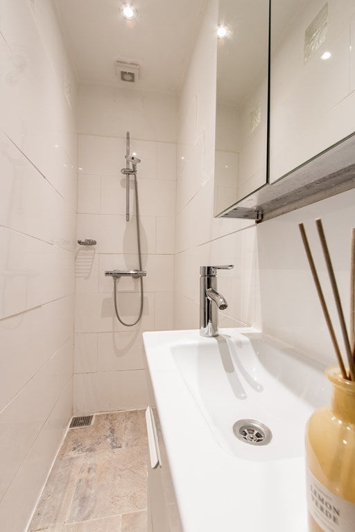 Badkamer, gerenoveerd met inloopdouche, badkamermeubel met wastafel en hangend toilet.