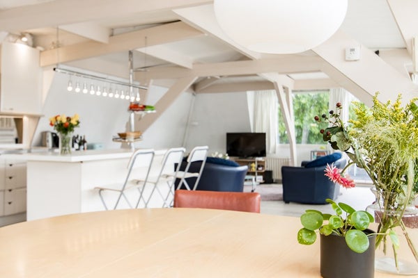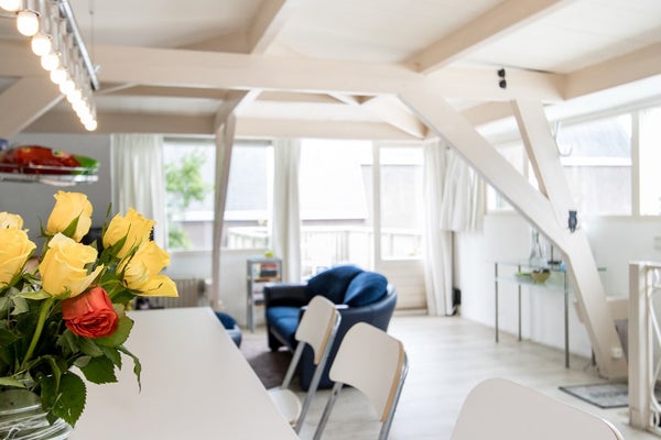 De originele balken en houten dakconstructie geven deze ruimte een uniek karakter en sfeer.