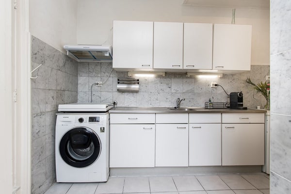 Eilandkeuken met bar, inductiekookplaat, koelkast en wasmachine.