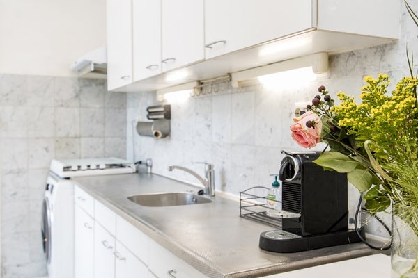 Gebruikte en volledig ingerichte keuken met apparatuur en deur naar balkon.