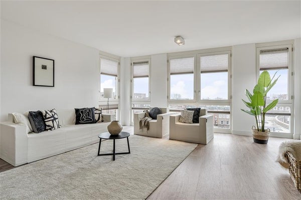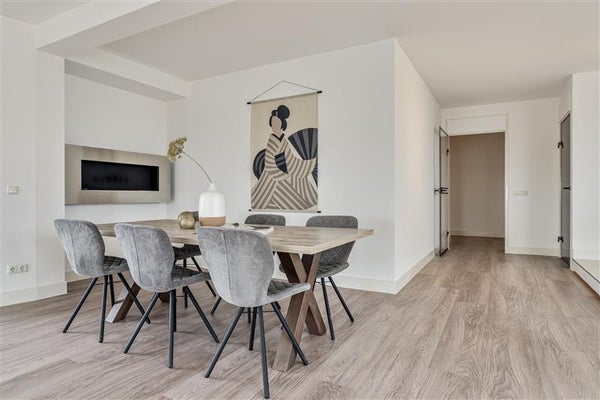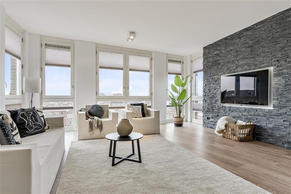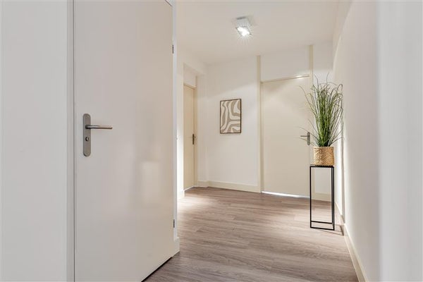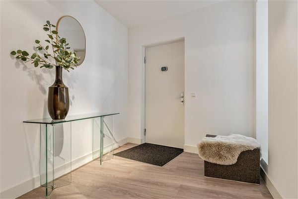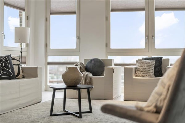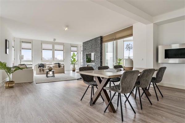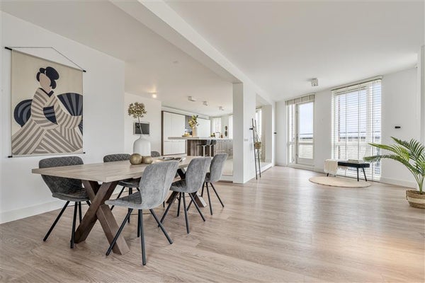 Betreed het penthouse en je wordt direct omarmd door de warme sfeer en de lichtinval die door de hoge raampartijen binnenvalt. De entree leidt je naar een royale woonkamer waar ruimte, design en comfort perfect samenkomen. Stel je voor: na een lange dag in de stad stap je je eigen paleisje binnen, schop je je schoenen uit en plof je neer op de bank met een glas wijn.