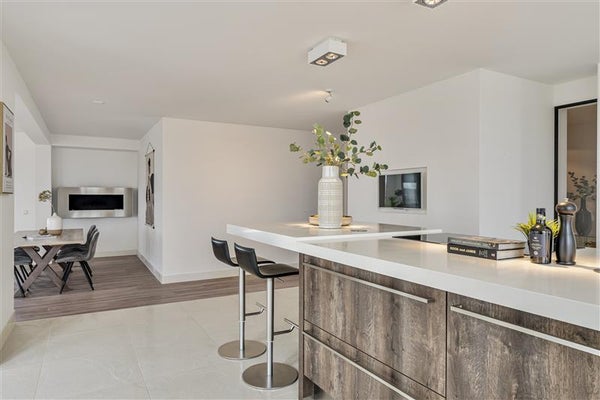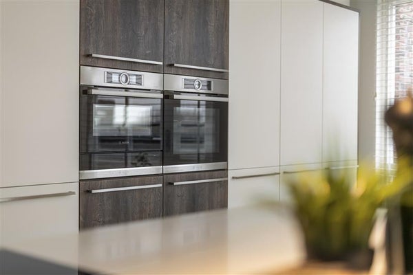 De keuken spreekt tot de verbeelding: grote kastenwand met aparte koelkast en diepvrieskast, een stijlvol kookeiland en luxe apparatuur (zoals dubbele combi-oven, kokend waterkraan, vaatwasser en inductiekookplaat) maken koken hier een feestje. Bereid een uitgebreid diner terwijl je partner of gasten gezellig aanschuiven bij de bar. De open opzet van de keuken sluit naadloos aan op de eetkamer en woonkamer, perfect voor etentjes of een relaxte avond met familie.