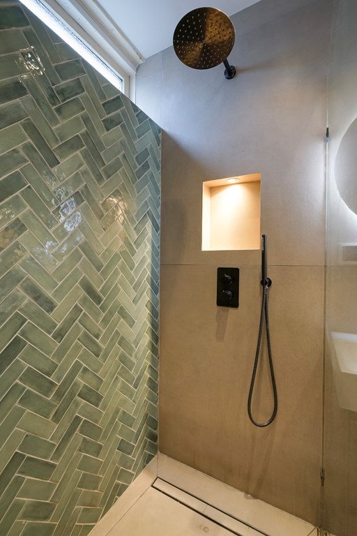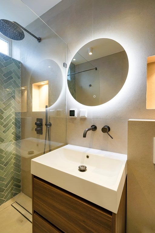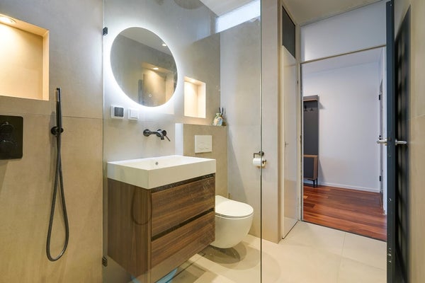 De volledig gerenoveerde badkamer is strak en stijlvol, voorzien van een inloopdouche, toilet, wastafelmeubel en een handige vaste kast.
