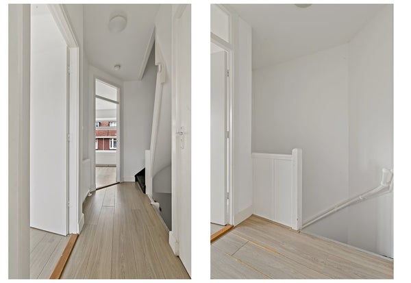 Op de tweede etage bevinden zich twee kamers van resp. 11 m2 (voorzijde woning) en 8,5 m2 (achterzijde woning). Er is een separate badkamer met een douchecabine, wastafel en handdoekradiator.