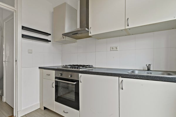 De keuken is tevens gelegen op de eerste etage, aan de achterzijde van de woning. De keuken is voorzien van een 4 pits gasfornuis, een elektrische oven en een afzuigkap (er is ruimte om een tafelmodel koelkast te plaatsen). De keuken heeft ruime opbergmogelijkheden.