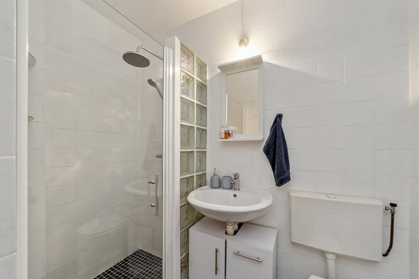 De volledig betegelde badkamer is netjes afgewerkt en uitgerust met een toilet, wastafel een comfortabele inloopdouche.