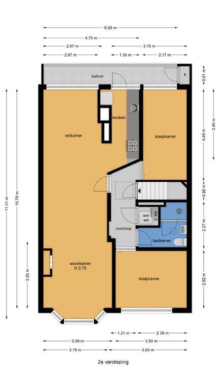 - De bovenwoning heeft een woonoppervlakte van 78 m² en beschikt over 3 kamers, waarvan 2 slaapkamers;