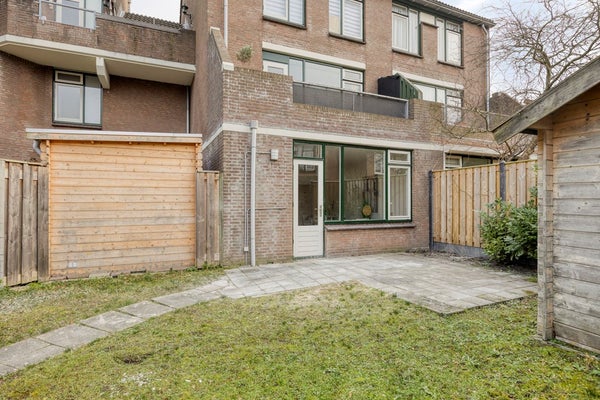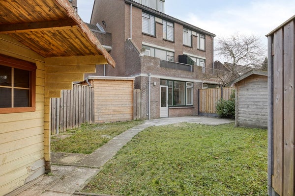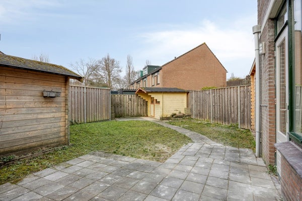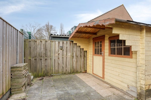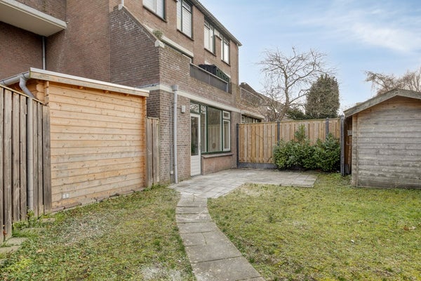De achtertuin is gelegen op het Zuid-Westen en loopt ver door naar achteren, waardoor er altijd wel zon te vinden is. Er is een vrijstaande houten schuur en een achterom.