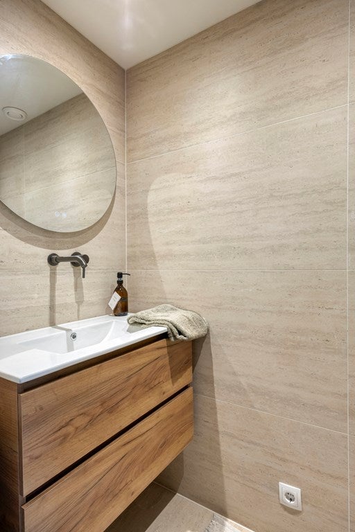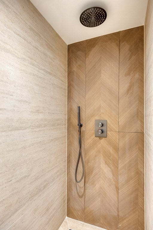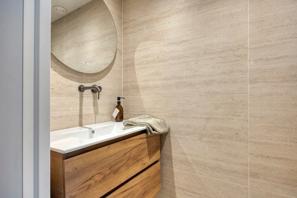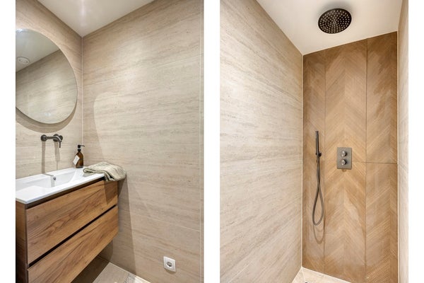 De nieuw betegelde badkamer is voorzien van een inloopdouche met regendouche en een wastafelmeubel, het aparte toilet is in dezelfde stijl betegeld en voorzien van een fonteintje.