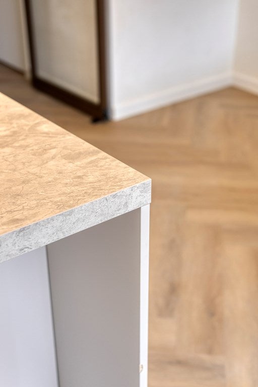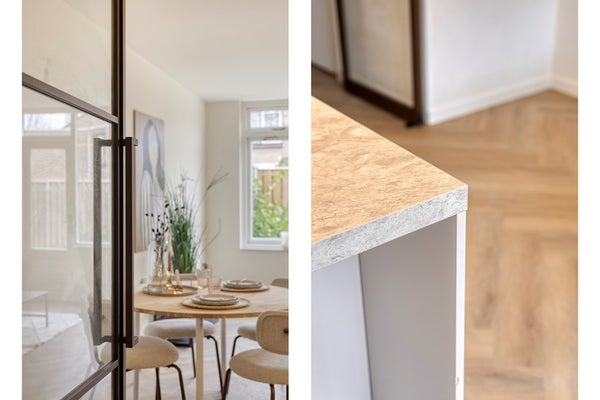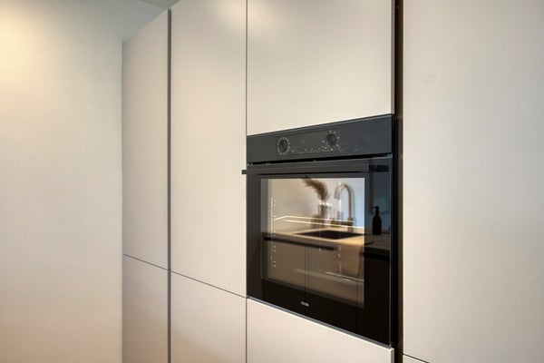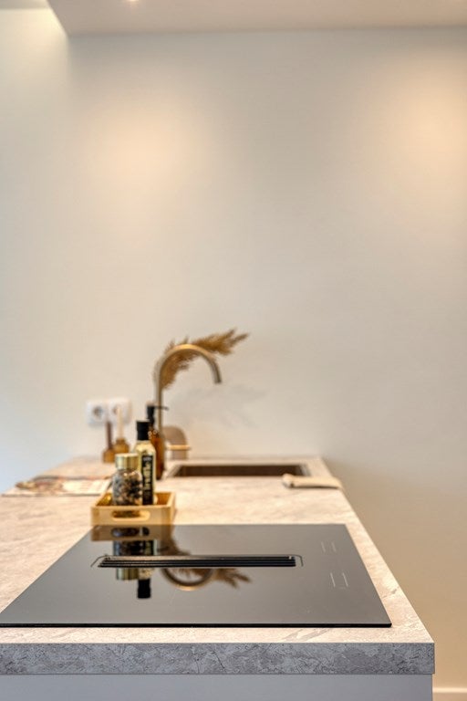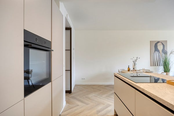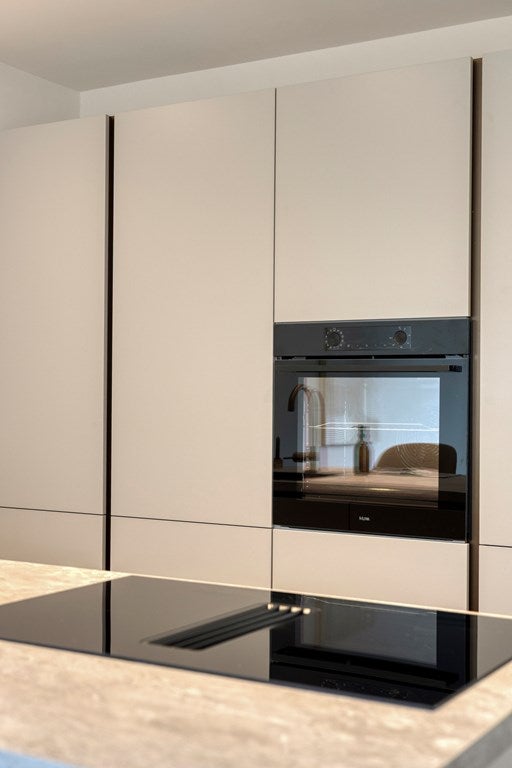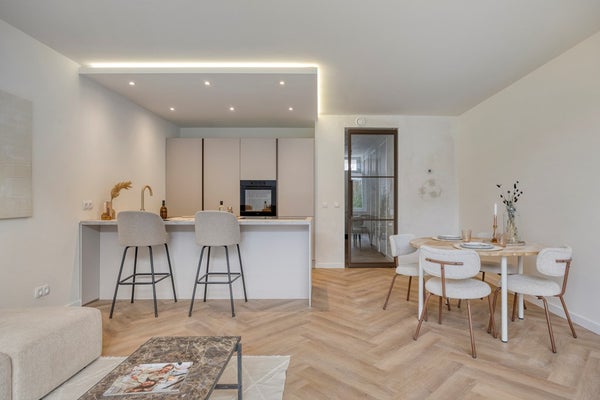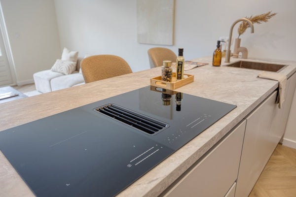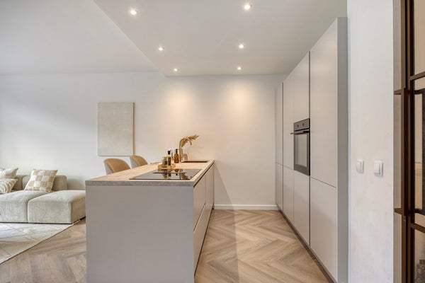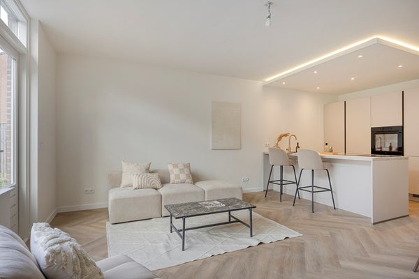 De woonkamer aan de achterzijde met open keuken is circa 6,1 x 4,9m groot en geeft toegang tot de achtertuin. De keuken is voorzien van inbouwapparatuur (koel/vriescombinatie, combi-oven, inductiekookplaat met ingebouwde afzuiging, vaatwasser) en een kook/spoel eiland, alles nieuw en ongebruikt.