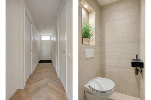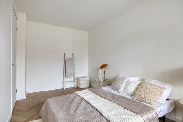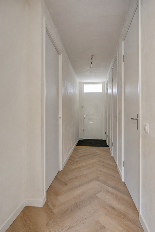Binnenkomst in een hal die toegang geeft tot alle ruimtes. Hal, woon- en slaapkamer zijn voorzien van een mooie PVC visgraatvloer. De slaapkamer aan de voorzijde is circa 4,7 x 2,7m groot en ligt aan een rustige straat waar alleen lokaal verkeer komt. Je kijkt uit over een groenvoorziening/parkeerplaats, zonder directe overburen.