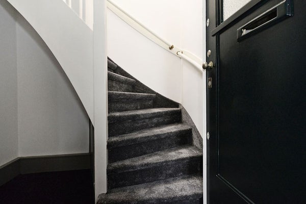 Intercom, entree appartement, hal, vernieuwde meterkast, gestoffeerde trap naar tweede verdieping.