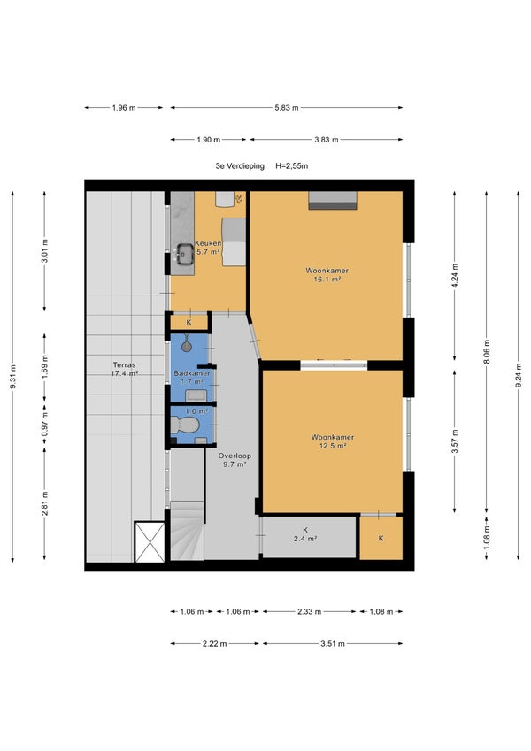 - De galerijflat heeft een woonoppervlakte van 54 m² en beschikt over 2 kamers, waarvan 1 slaapkamer;