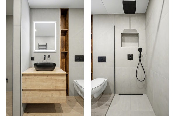 Het separate toilet is eveneens modern afgewerkt met wandcloset en fonteintje.