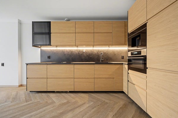 De strak afgewerkte open keuken is modern en compleet uitgerust met onder andere: